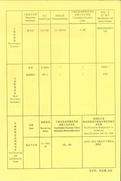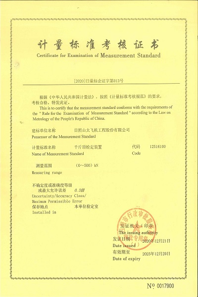 公司已取得压力表计量、液压千斤顶的计量标准考核证书, 目前正在申请CNAS认可, 计划增加扭矩扳手、吊具检测等多项计量能力。